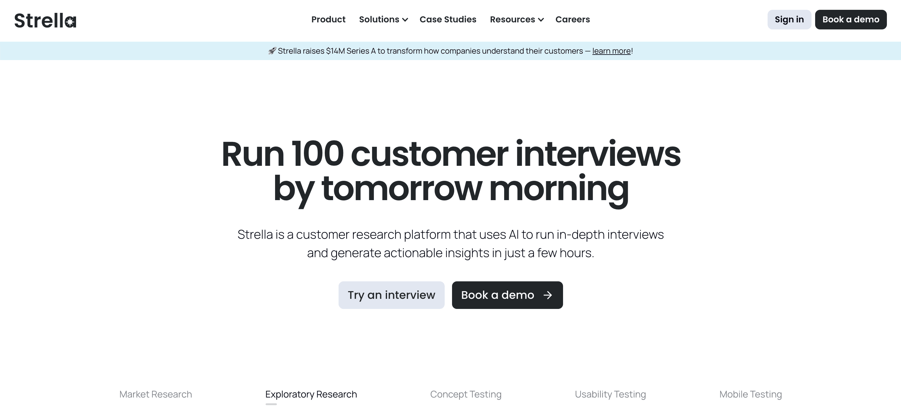 Strella is an AI-moderated interview platform focused on conversational consumer research across voice and video modalities, with participant recruitment included.