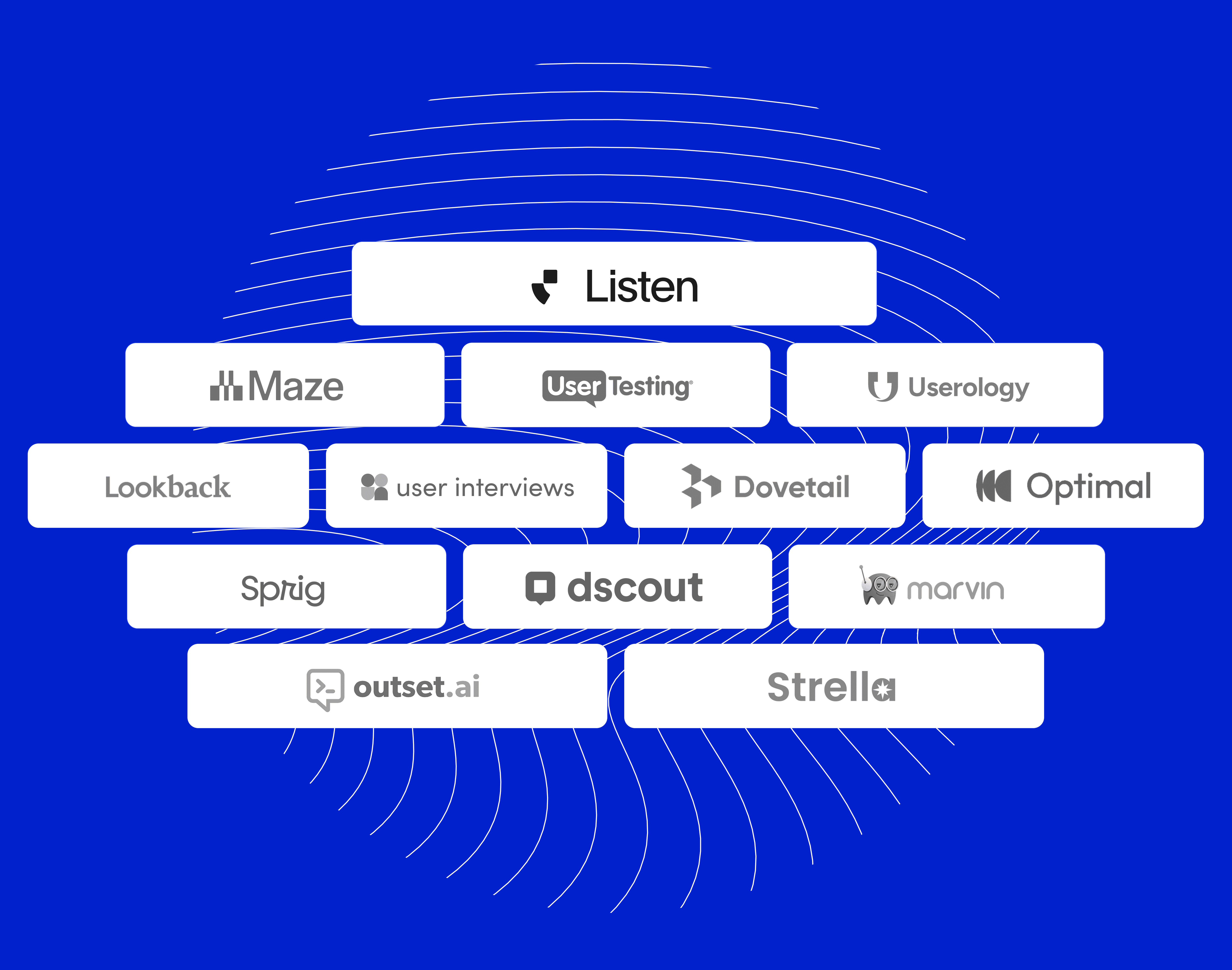 Running AI-moderated user interviews at scale with adaptive probing and integrated recruitment | Adaptive AI moderation, verified participant recruitment, and structured outputs in one workflow | Listen Labs, Outset, Strella |