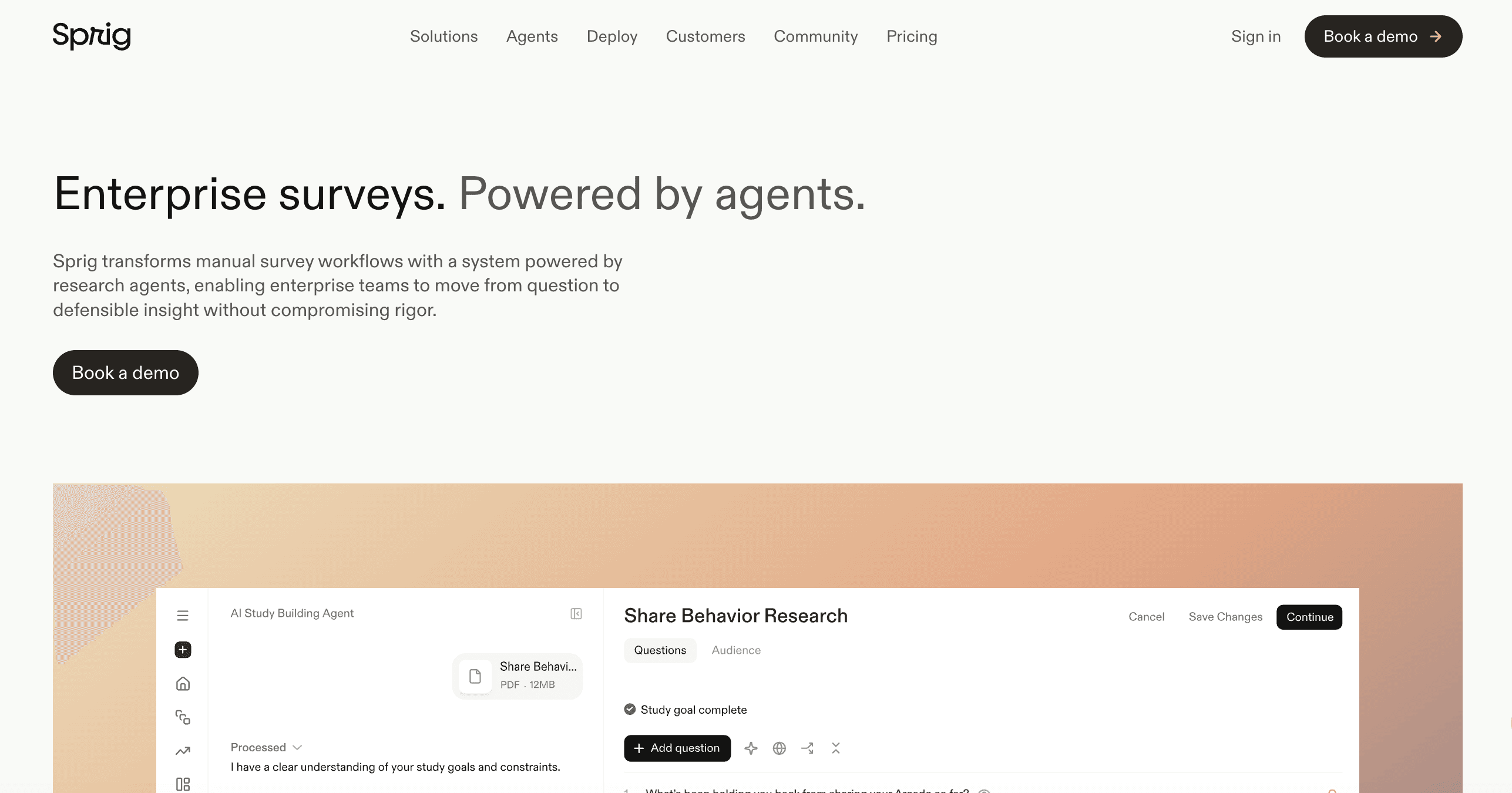 Sprig is an in-product research platform that captures user feedback and behavior directly inside a live product. It combines AI-powered microsurveys, session replays, and heatmaps with AI agents that support study design, fielding, and synthesis, targeted at continuous product feedback rather than external moderated interviews.
